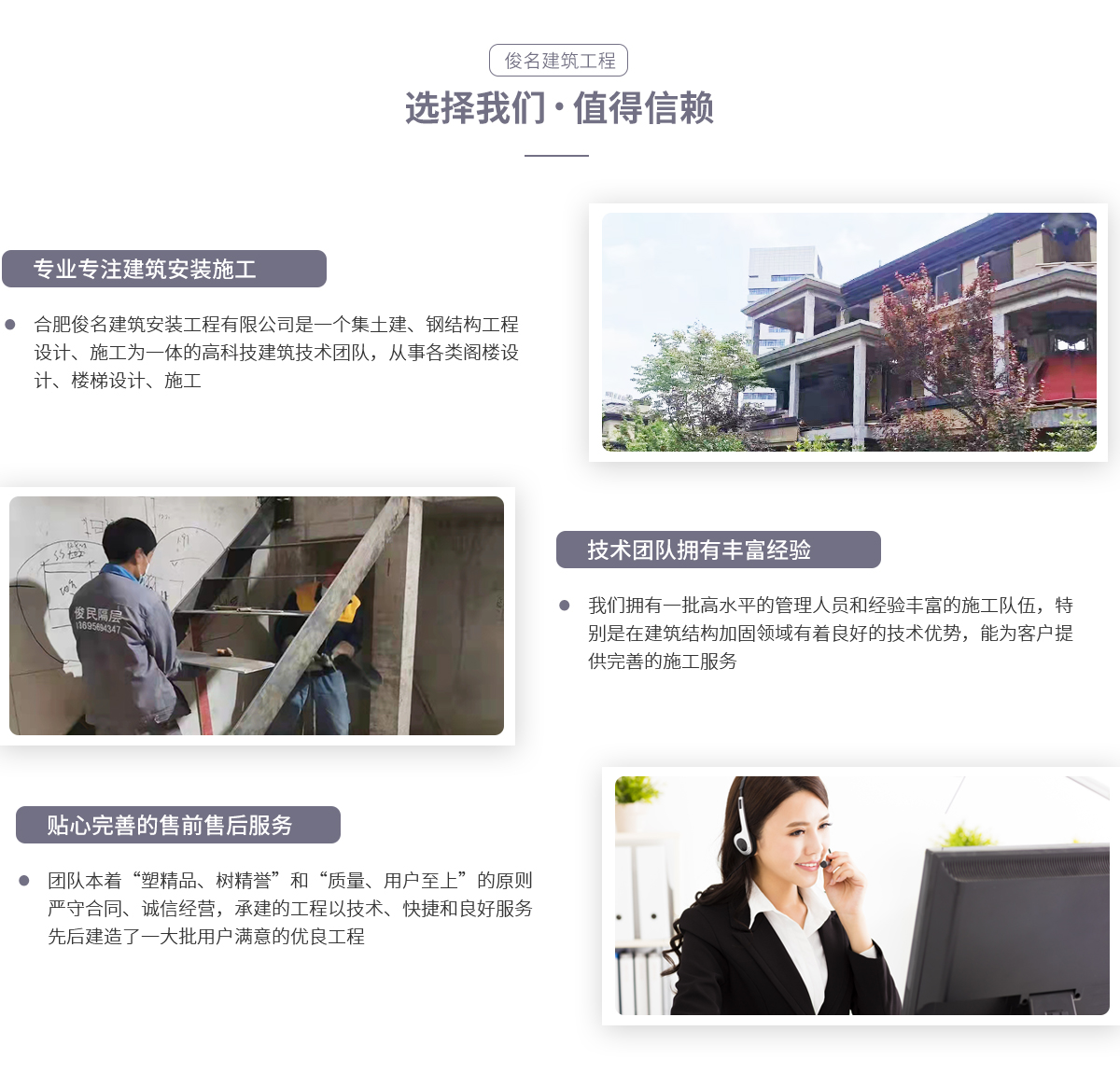 - 合肥俊名建筑安裝工程有限公司是一個集土建、鋼結構工程設計、施工為一體的高科技建筑技術團隊,從事各類閣樓設計、施工。我們擁有一批高水平的管理人員和經(jīng)驗豐富的施工隊伍,特別是在建筑結構加固領域有著良好的技術優(yōu)勢。團隊員工精誠團結,以“尊重規(guī)范,拒絕平凡”為宗旨,為客戶提供完善的施工服務。團隊本著“塑精品、樹精譽”和“質(zhì)量、用戶至上”的原則,嚴守合同、誠信經(jīng)營,所...